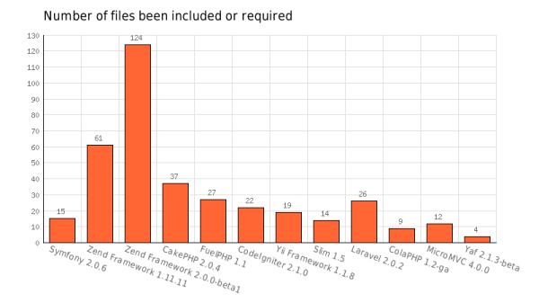 6. 文件数量 打开hellow word用到included or required in 文件的数量.越小越好,zend很多,yii19个,yaf才4个,不快才怪。