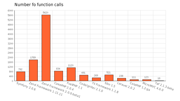 5. 调用方法的数量(Facebook XHProf) 单个hello word页面调用了多少方法,zend5620个方法,是不是太臃肿了。