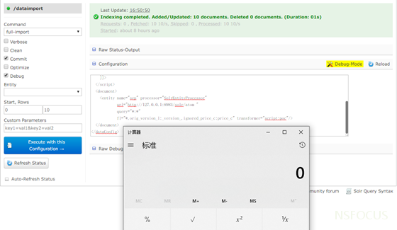 漏洞的产生就在这个里,攻击者构造恶意的代码在里,当dofulldump对齐解析并正则式的进行值转换,导致恶意代码被执行,这个可以写入很多java的类,apache并没有对内容进行安全过滤与限制,导致可以注入任意的恶意代码,使其服务器进行执行。我们构造了一个执行计算器的POC,我们截图看下利用的效果: